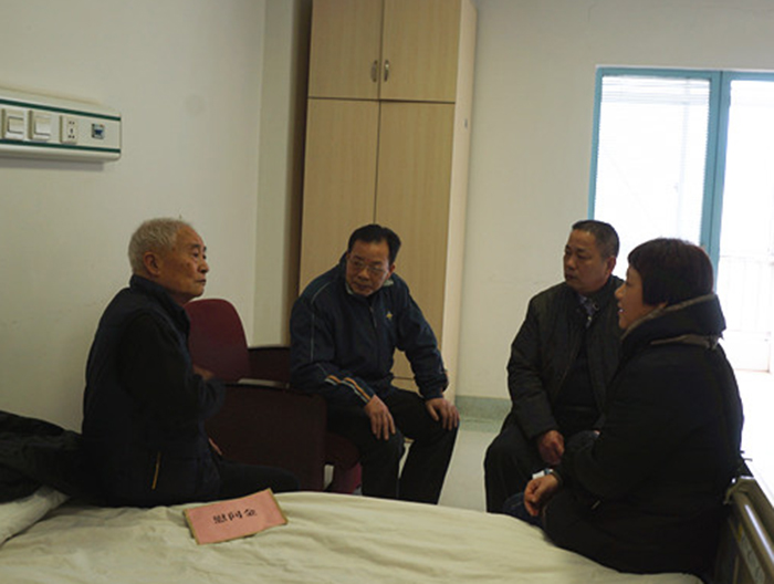 集團公司黨委副書記、工會主席張友坐(右二),總工程師覃炳賢(左二)到醫(yī)院看望慰問患病住院的老同志。